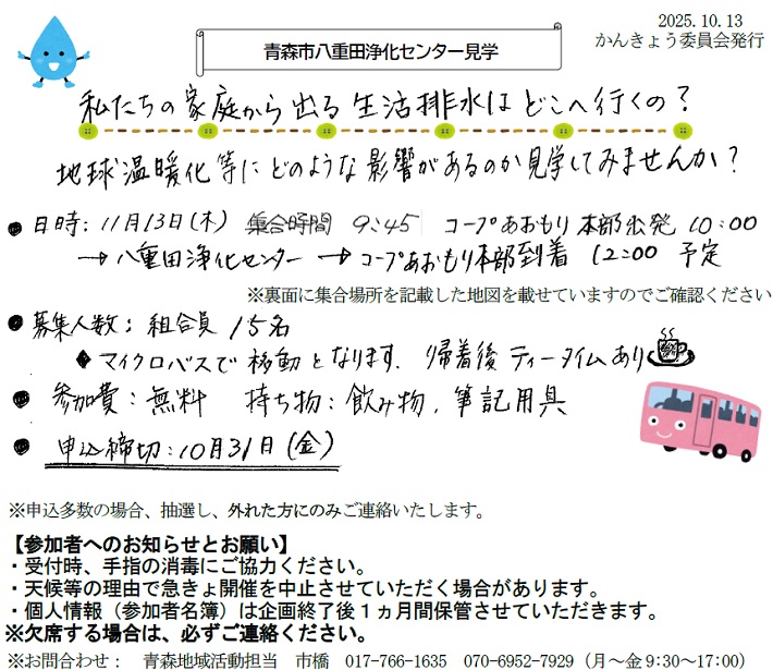 【青森地域】かんきょう境委員会主催「八重田浄化センター見学」を開催します。