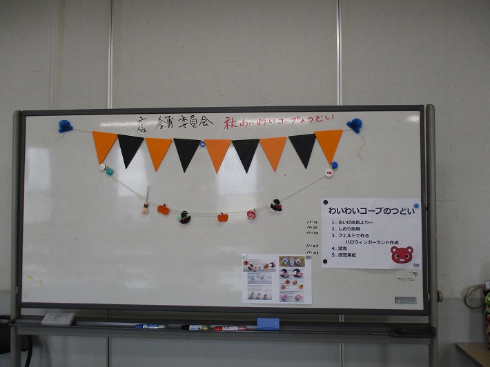 次にフェルトで簡単にできるハロウィンのガーランドを作りました。みんなではさみとグルーガンを使用して、かわいいお化けとかぼちゃができました。しおりにある生協食パンのサンドウィッチと牛乳の試食をしながら、しおりの説明をしました。