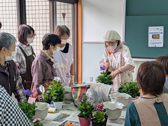 その後、講師の先生からハロウィンの寄せ植えを習いました。3種類のお花を選んで植えました。