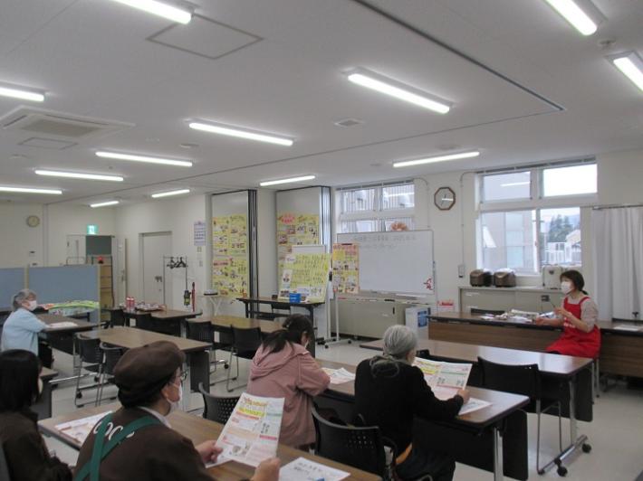 はじめに、しおりの表面「コープあおもり開発品」の説明をしました。次にしおりの商品を使ったレシピを紹介し、調理を4人1組で和気あいあいと行うことができました。
