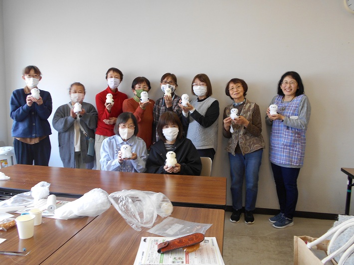 学習の後は、毛糸のポンポンで作る「シマエナガ」作りをしました。毛糸のポンポンを作るのに皆さん真剣に取り組んでいました。2つのポンポンをくっつけると、だんだんシマエナガの形になってきて「カワイイ♡」という声が聞こえてきました。目やくちばし、羽をつけて、コロっとかわいいシマエナガが出来上がりました!