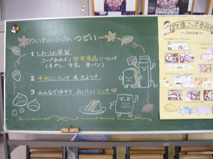 はじめに、致遠自慢の委員さんの手作り黒板アートと活動ニュースを紹介しました。次に、つどいしおりの学習を行いました。コープあおもり開発品の説明では、もやしのゆで方や保存方法、牛乳や食パンのこだわりを伝えました。また、平和について考えようでは、みんなで平和について話し合いました。