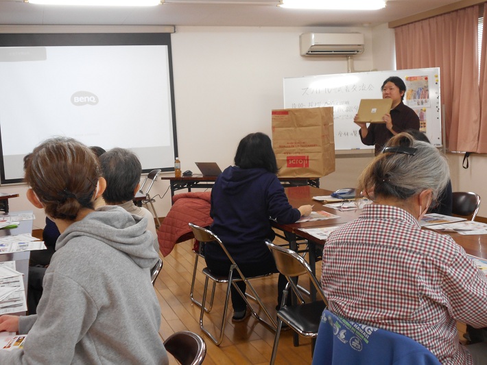 はじめに、スクロールの職員から、どのように商品を開発しているのか、商品に使用されている材質へのこだわりなどについて説明がありました。また衣類の回収を通して、世界の子どもたちにワクチンを届ける社会貢献活動も行っていることについて説明があり、不要になった服をリサイクルすることで、私たち消費者も社会貢献活動の1つに繋がることを学びました。