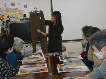試着交流の時間では、実際に商品を触って手触りを確かめたり、気になった商品を試着してみたりしました。皆さん気になる商品を見つけることができ、「来週注文してみようかな」と声が聞こえました。
