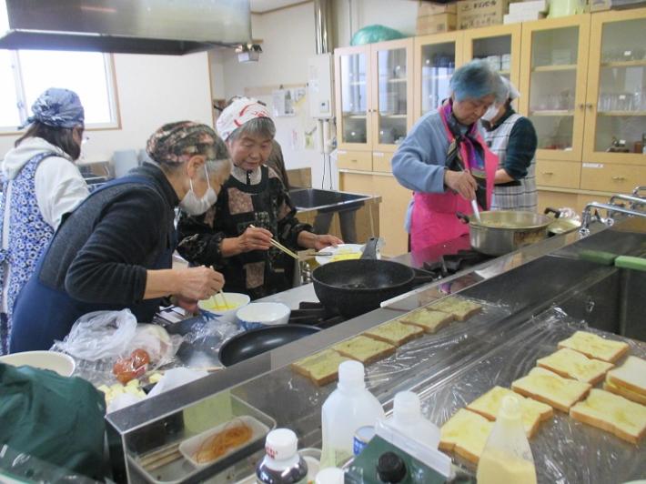 次に、コープあおもり開発品について説明をして調理をしました。卵焼きを焼いたり、パンを切ったり、フルーツを切ったりと役割を分担して卵サンドとフルーツサンドを作り、皆さん和気あいあいと楽しく調理しました。