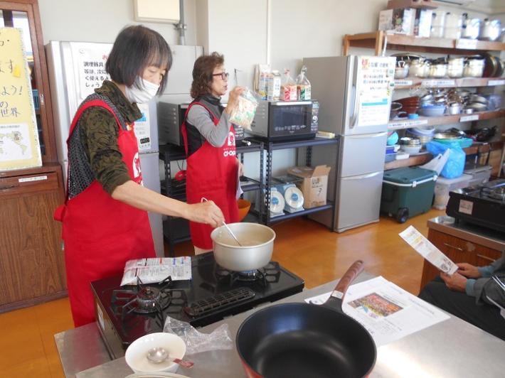 次に、しおりの開発品について学習しました。もやしの上手な茹で方など実演して、その後、本日の試食品を委員さんと参加者で一緒に作って、わいわいガヤガヤ楽しく調理をすることが出来ました。