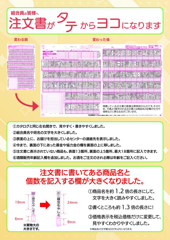 Week10月4週号から宅配OCR注文書の文字拡大とヨコ折デザインへの変更について 「注文書の文字が小さくて読みにくい」のお申し出が増加傾向にあります。組合員へより注文しやすくするため、注文書の文字を大きくし、より書きやすいデザインへ変更いたします。 宅配事業部