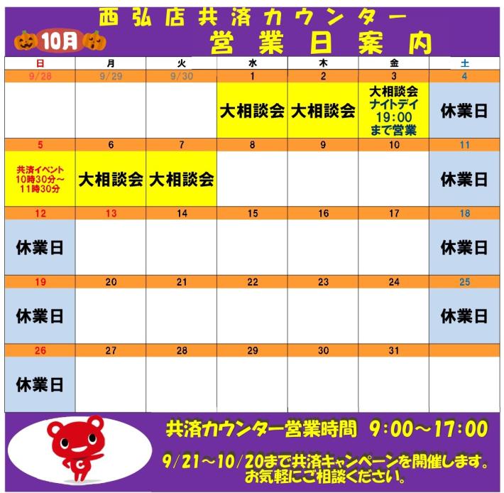 【西弘店】共済カウンターカレンダー(2025年10月)