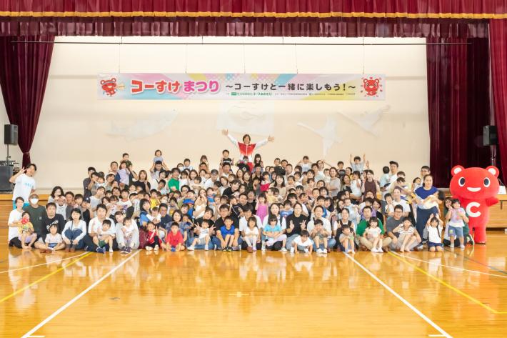 当日は「ひろみちお兄さんの親子体操」のほか、ジャグリングやマジックショーなど楽しい催し物や「ストライクナイン」「サッカーチャレンジ」「ハンドタオルでコーすけづくり」「光るうちわづくり」などアトラクションやワークショップでは、地域のお子さんや親御さんが楽しいひと時を過ごして頂けたと思います。コーすけも人気で、あちこちで写真撮影のために立ち止まりました(笑)