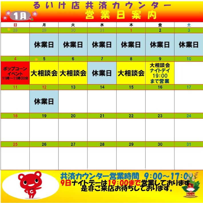 【るいけ店】共済カウンターカレンダー(2026年1月)
